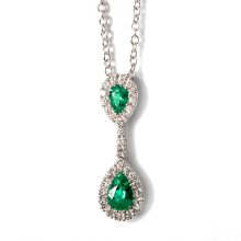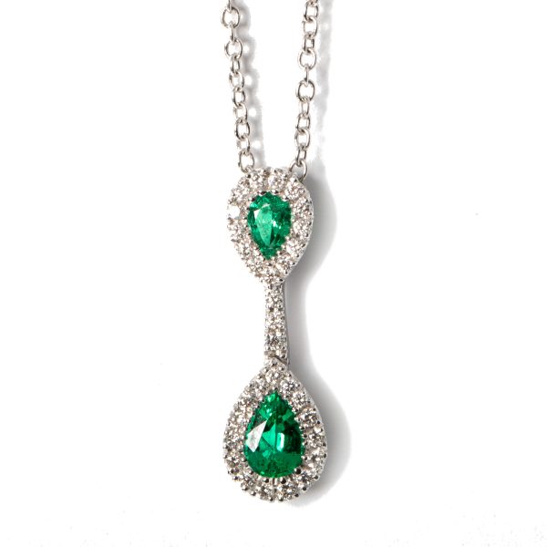 Catenina in oro bianco con pendente di smeraldo Goccia/doppio castone, e diamanti certificati, realizzata artigianalmente dalla ditta Davite & Delucchi di Valenza.