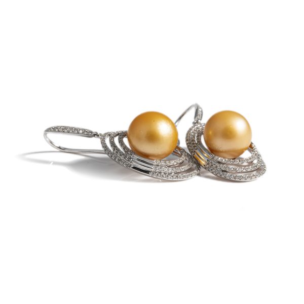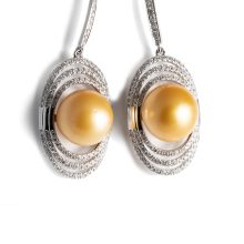 Orecchini pendenti in oro bianco, modello fantasia, con diamanti taglio brillante e Perla Australiana Gold di mm.12.